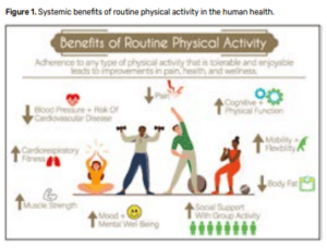 Physical activity is defined as any bodily movement produced by skeletal muscles that requires energy expenditure [1] and includes purposeful activity performed with daily routines and structured exercise programs devoted to the improvement or maintenance of fitness, health, and wellness. Exercise is a type of physical activity that is planned, structured, and often associated with repetitive movement. Physical activity and exercise play a key role in the prevention, management, and rehabilitation of multiple disease processes in conjunction with other healthy lifestyle behaviors and medical treatments.[2] Evidence supporting the benefits of regular physical activity in the prevention and treatment of chronic diseases has prompted increased integration and promotion of physical activity as a standard part of disease prevention and medical treatment.